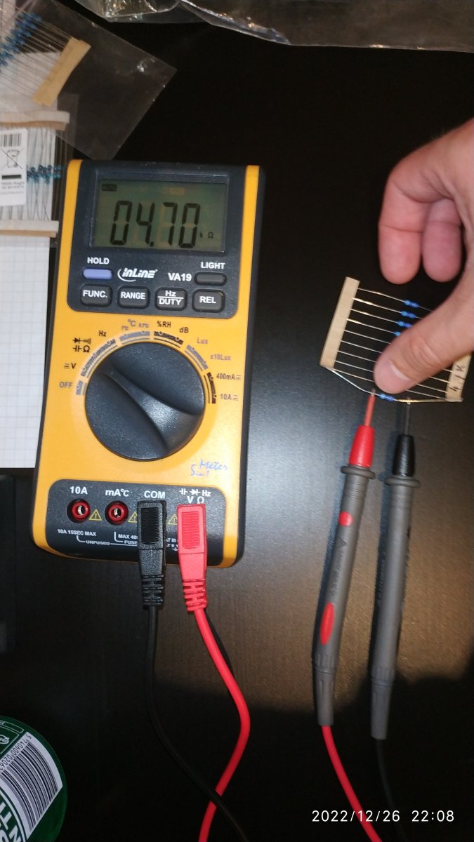 Next, take 4k7 resistor. If any doubts check the resistance with a multimeter: Set to resistance mode and measure across the sides. If it shows 4.7k, perfect. Even 4.67k or 4.73k is okay, there is always a small difference for measuring and tolerance.