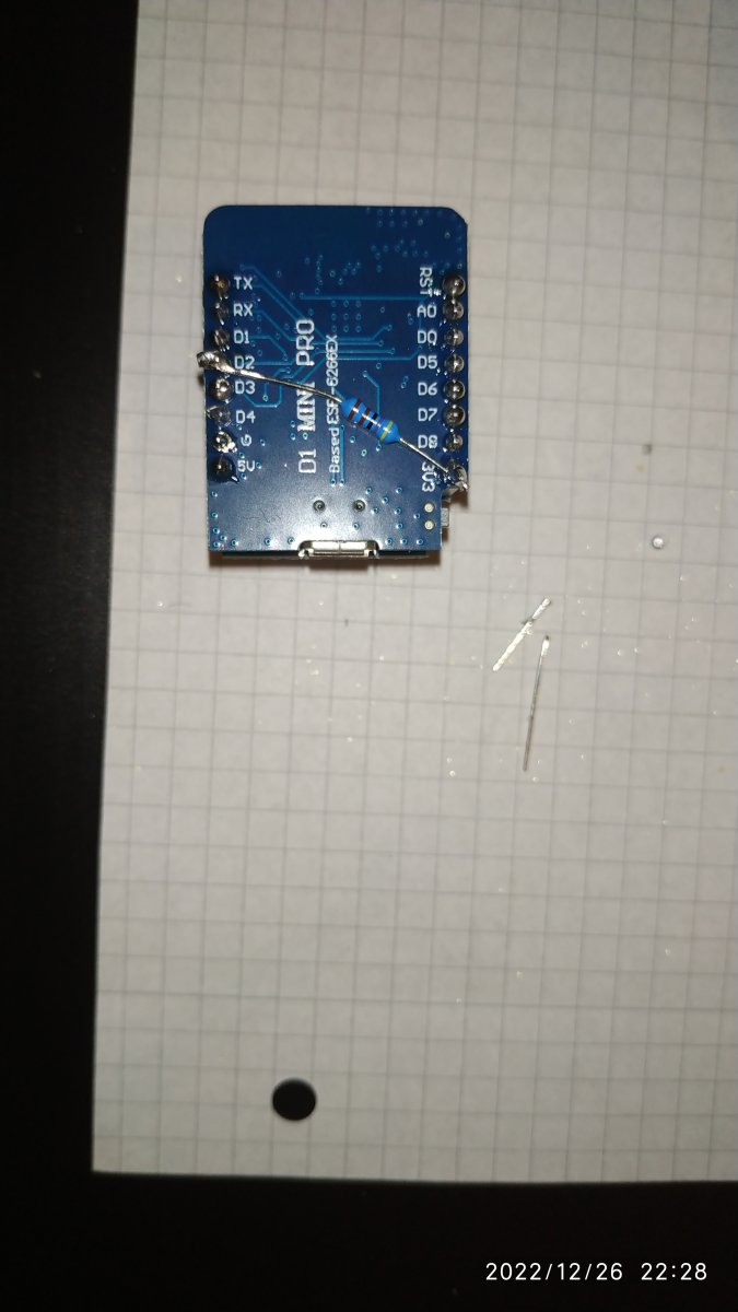 So solder the 4k7 resistor to D2 and 3.3V. Once soldered shorten the legs with pliers.