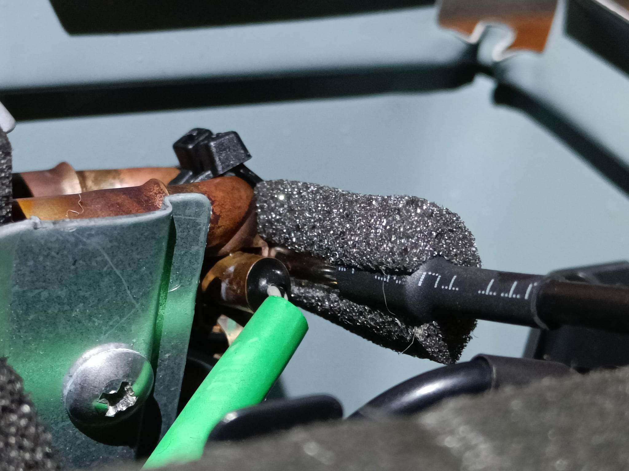 Parhaaksi todettu paikka kennon lämpötilaa mittaavalle anturille on ulkokennon putkistossa siellä missä sijaitsee MUZ-LN-lämpöpumpun oma “outdoor heat exchanger temperature thermistor” (ks. kuva alla). Ohjeessa tähän putkeen viitataan termillä yläputki.